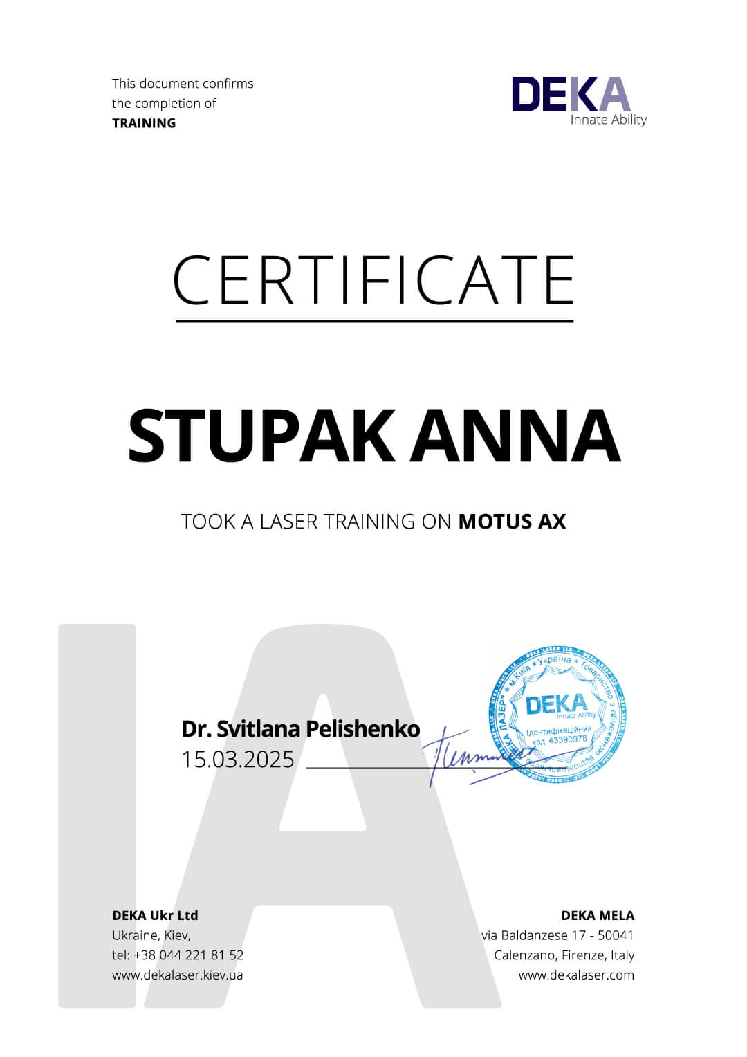 - Сертифікований курс з безпечної роботи з лазерними технологіями для косметології.