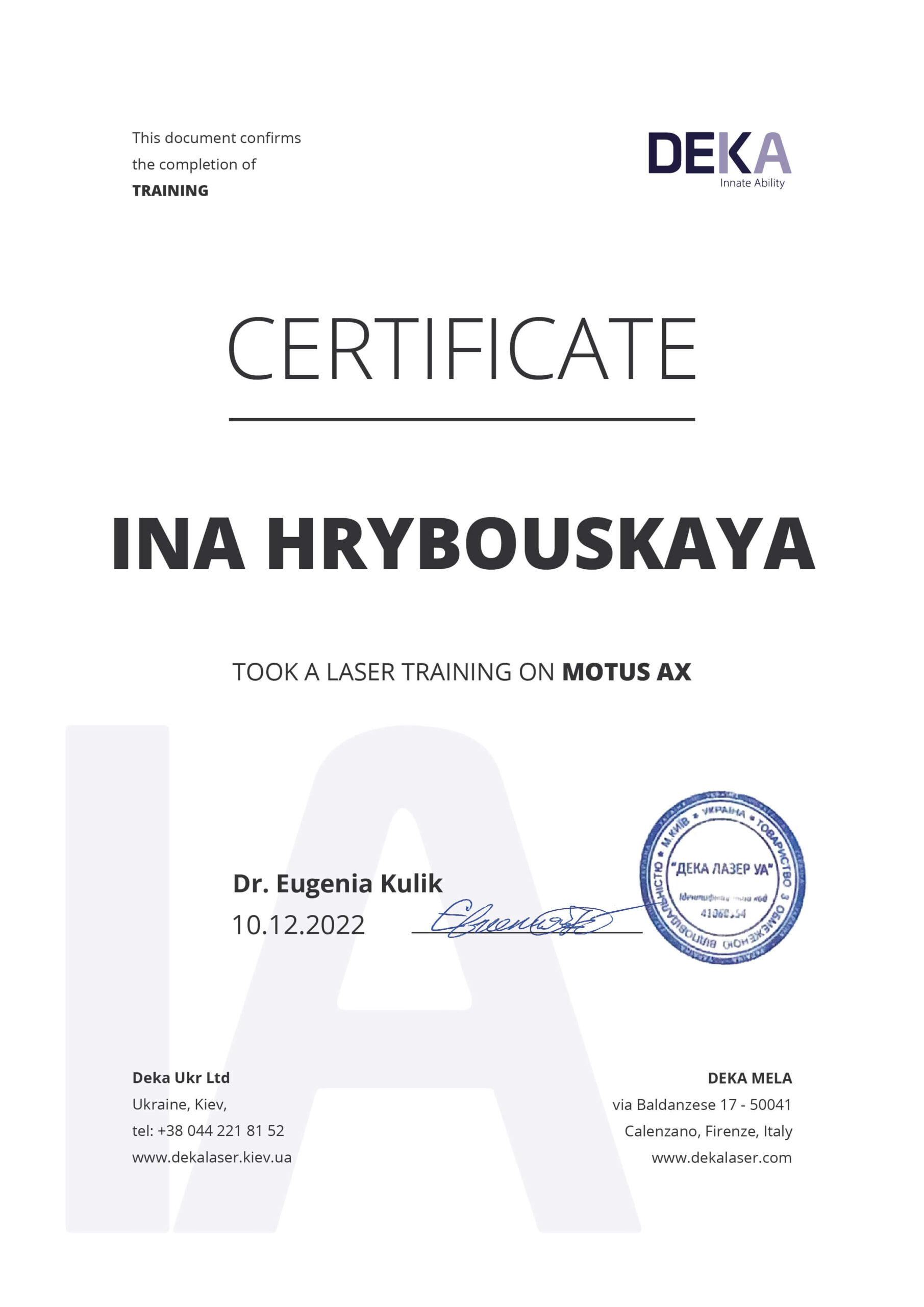 - Курс динамічної лазерної епіляції від італійської компанії DEKA на апараті MOTUS AX – олександритовий лазер за технологією MOVEO.