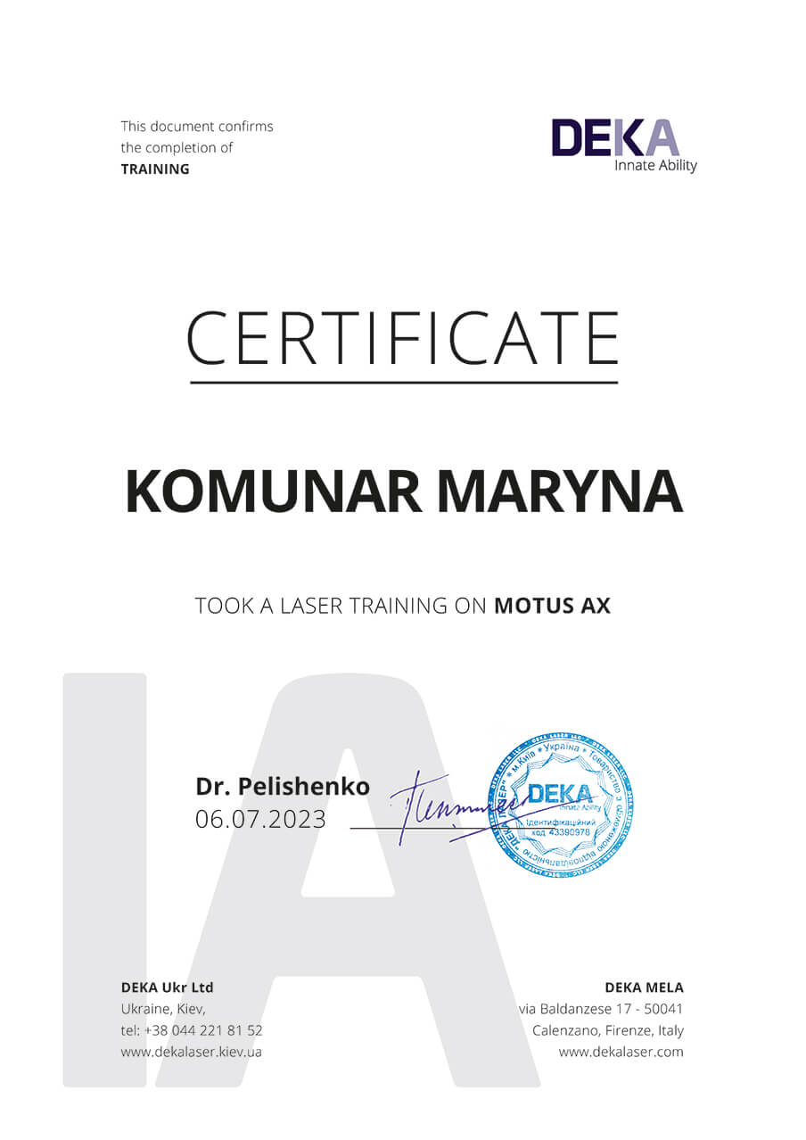 - Курс лазерної динамічної епіляції від італійської компанії DEKA на апараті MOTUS AX – олександритовий лазер за технологією MOVEO